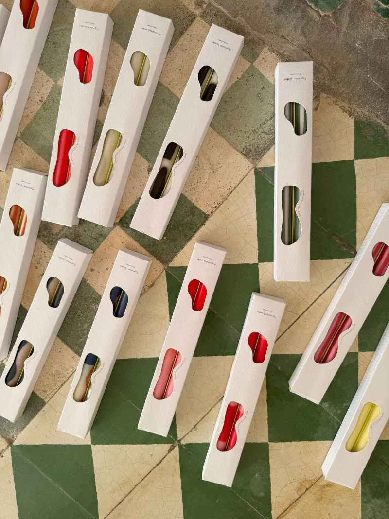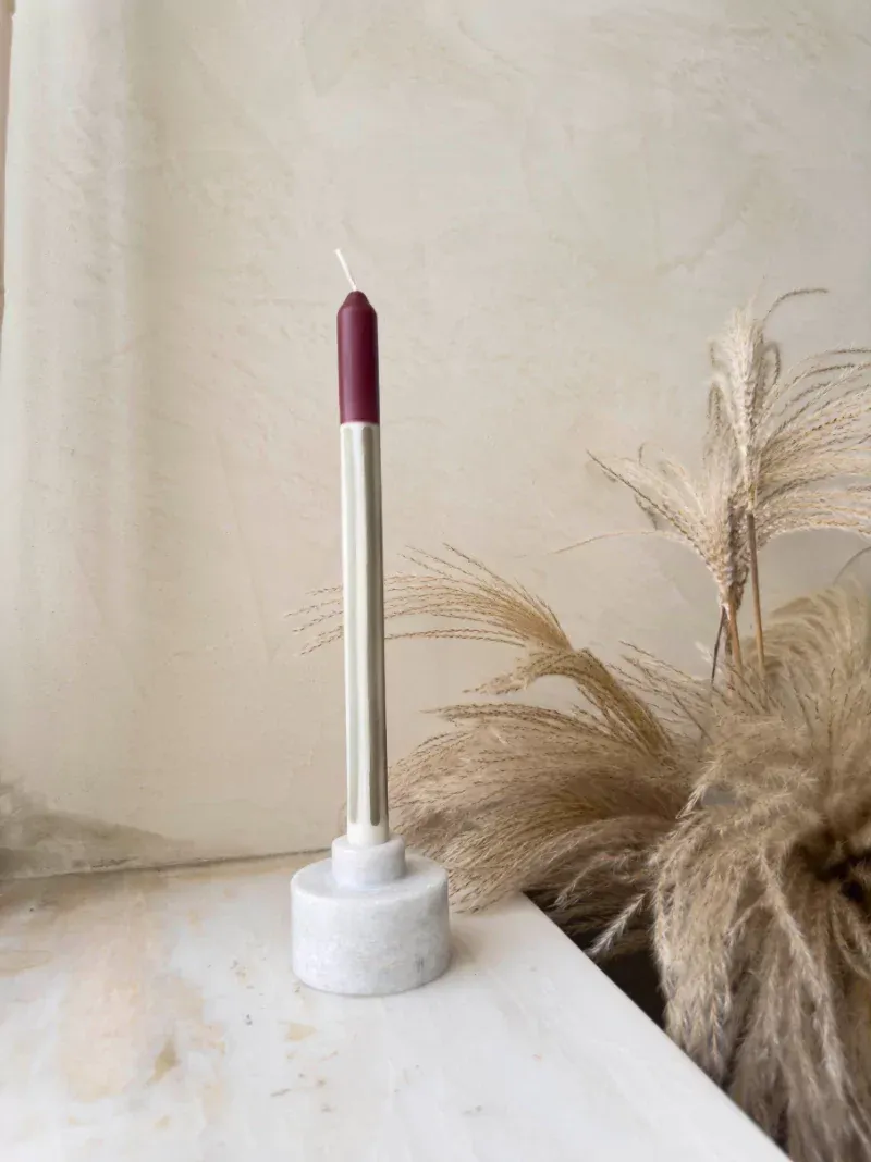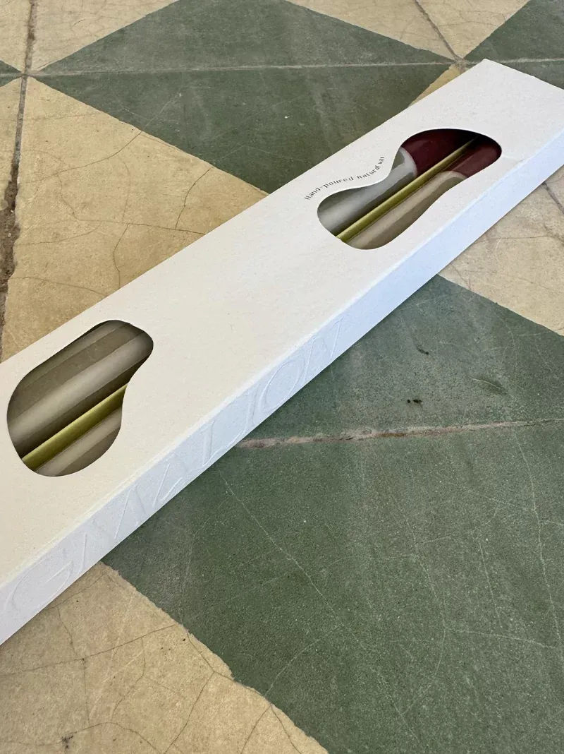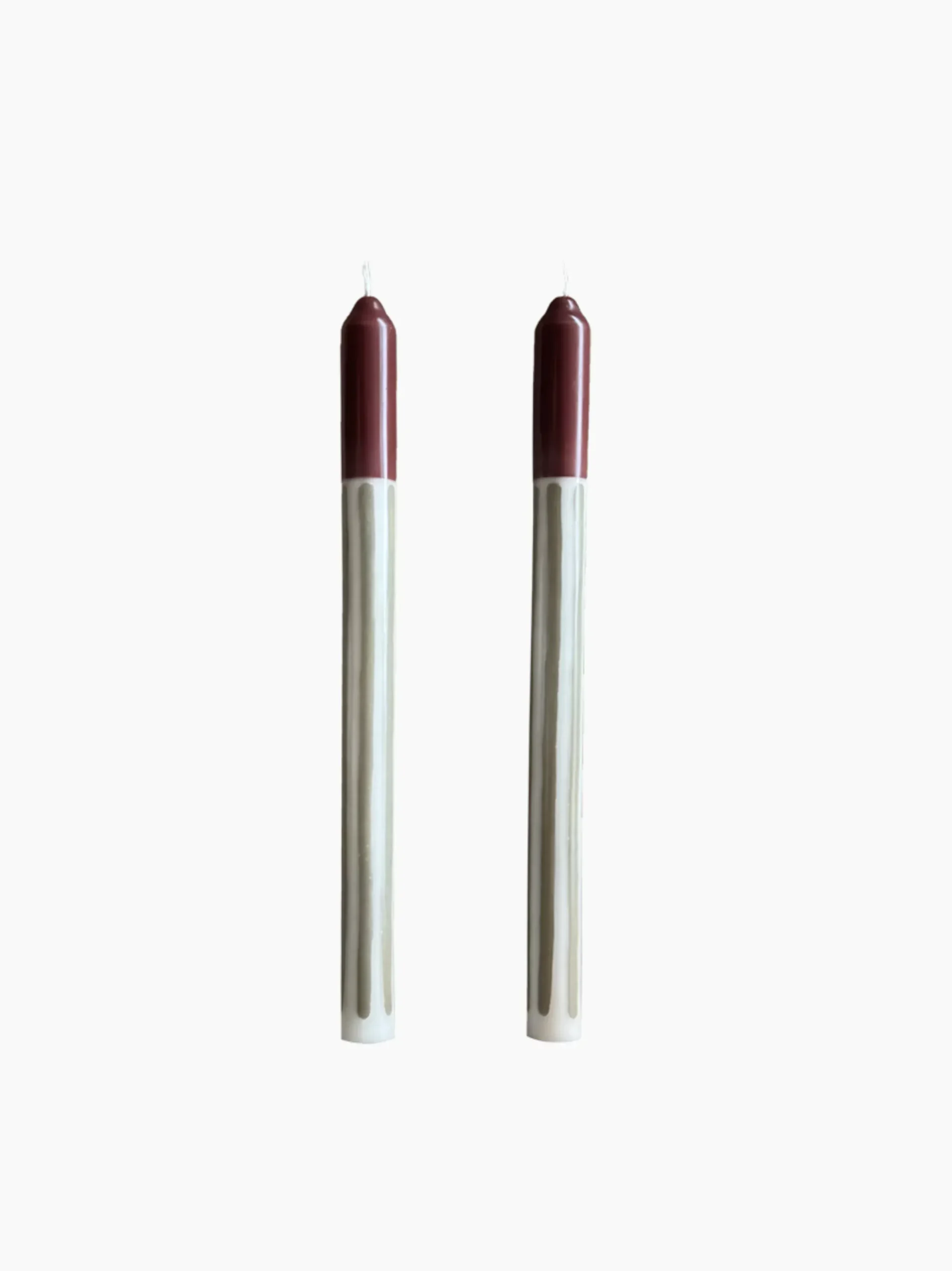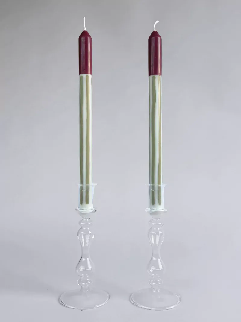 This set of 2 dinner candles is hand-poured from natural vegetable wax in organic stripes of racing green and off-white. A chic thank you gift the avid host.