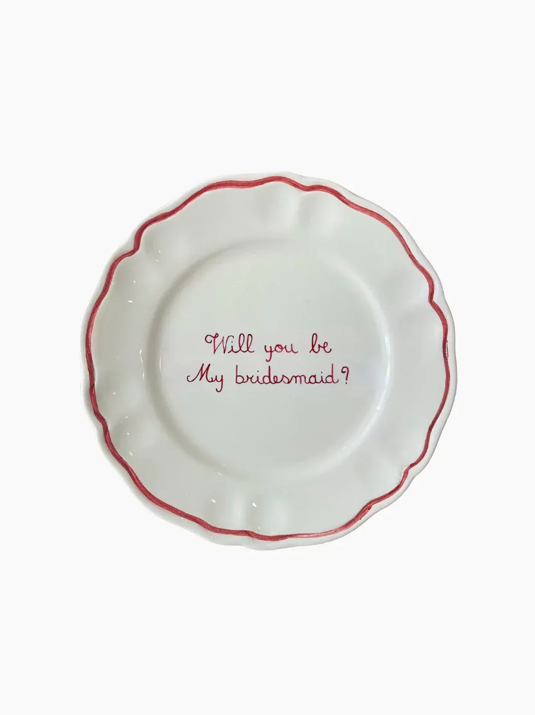 This plate set is artisanally painted in Italy, showcasing scalloped edging and handwritten details. A unique way to ask your bridesmaids to stand by your side on your big day and a thoughtful memento for years to come.