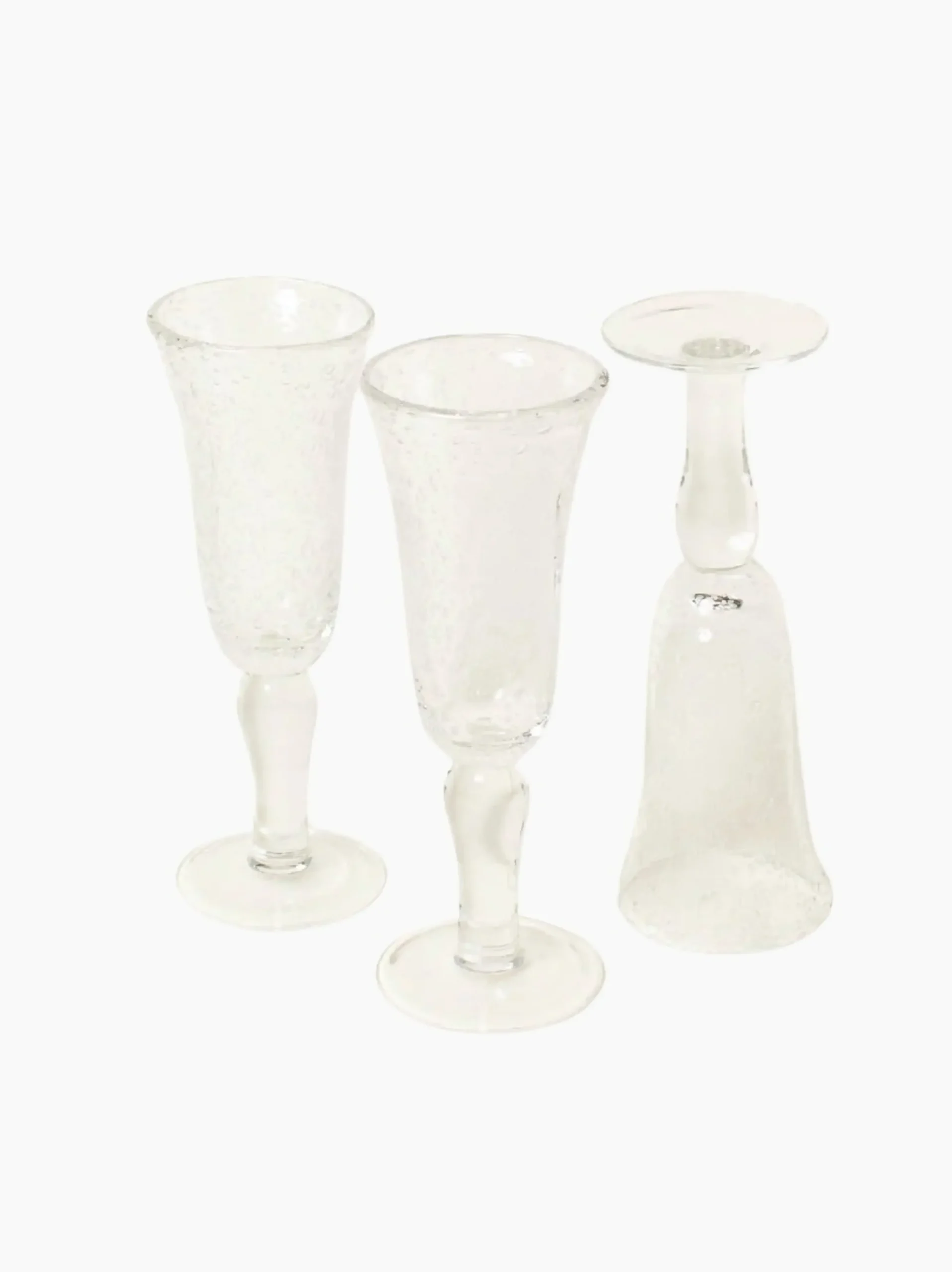 This set of vintage glasses are hand-sourced from France. Featuring hand blown chunky flutes with a flared top and thick base. For the design enthusiast, this makes a thoughtful homeware gift.