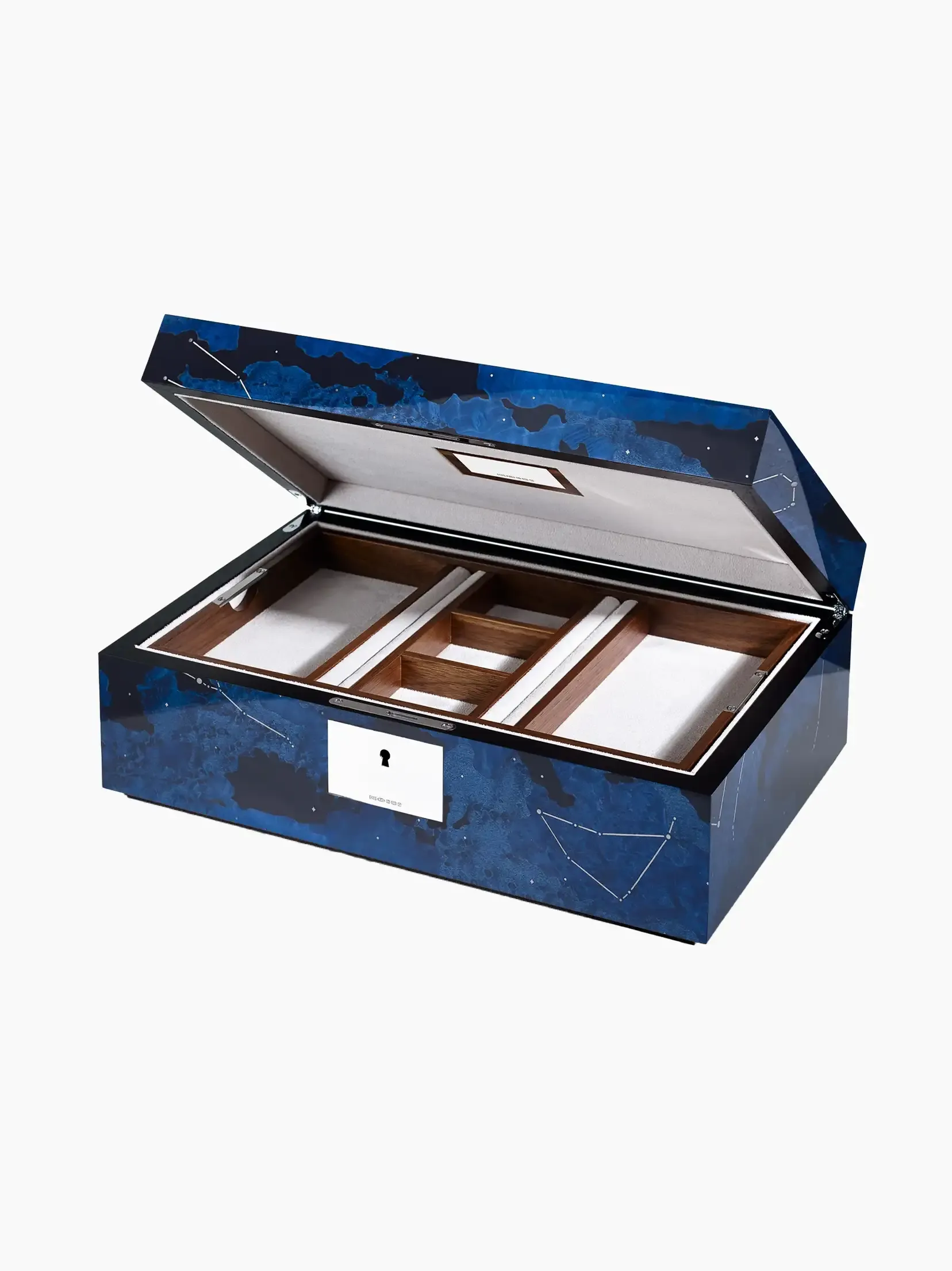 This jewellery box features a dreamy constellation intricately mapped out in grey anegre and embellished with twinkling mother of pearl stars. Crafted from dark stained walnut, it is complete with faux suede lining and a sterling silver escutcheon for a personalised touch.