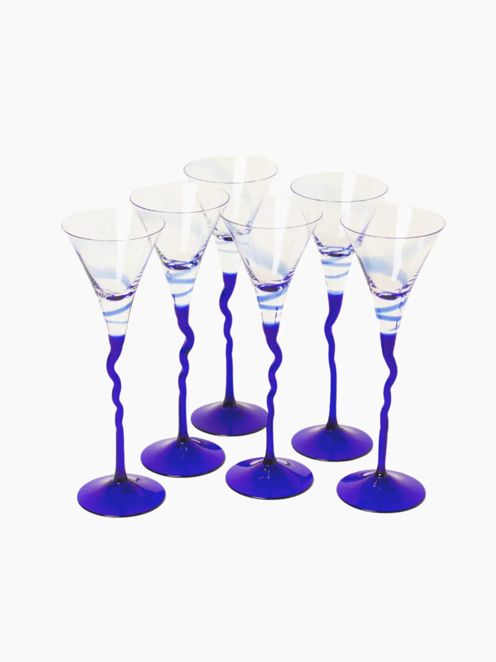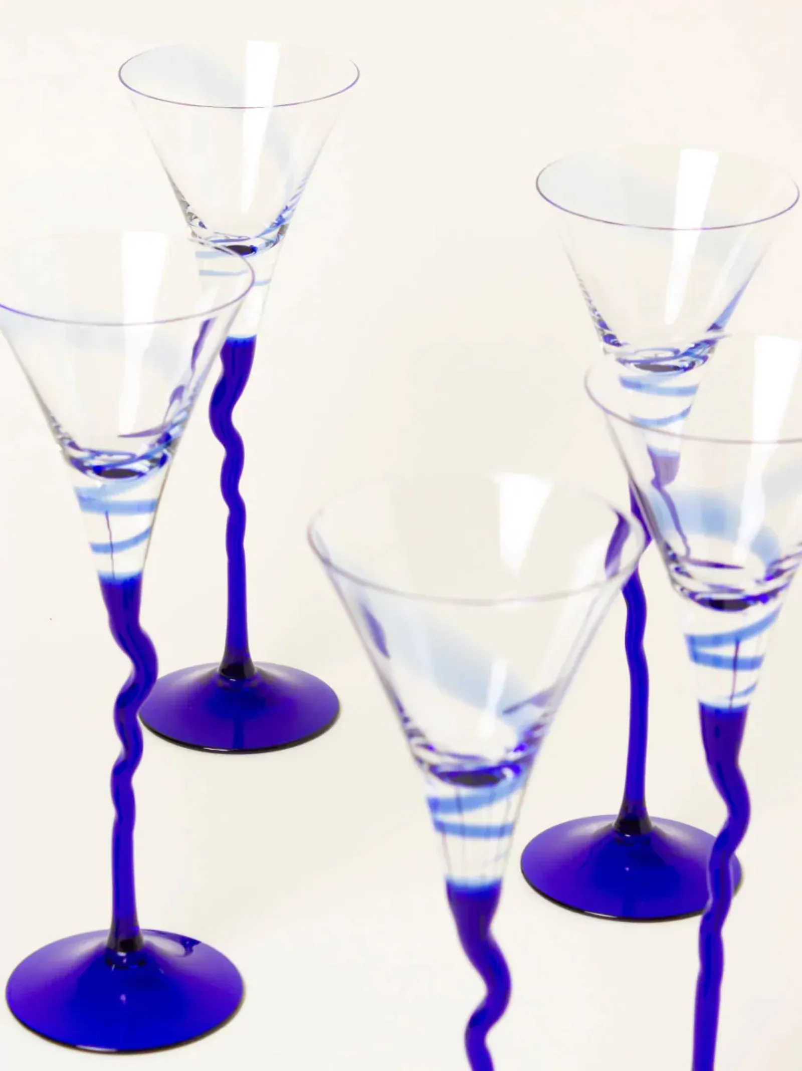This set of 4 blue liquor glasses have a clear flared top with a delicate blue swirl leading down to a wavy cobalt blue stem. Vintage and the perfect size for cognac, they make a great addition to his cigar room.