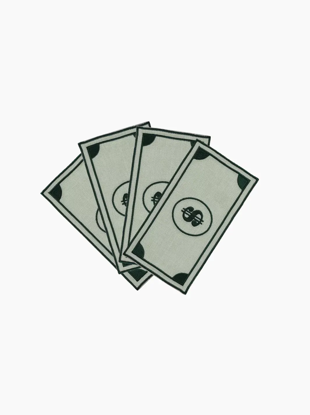 This set of four dollar bill cocktail napkins is crafted in green linen and finished with dark green Italian cotton embroidery. They make the perfect gift for a witty host and add a light-hearted touch to elevated dinner parties.