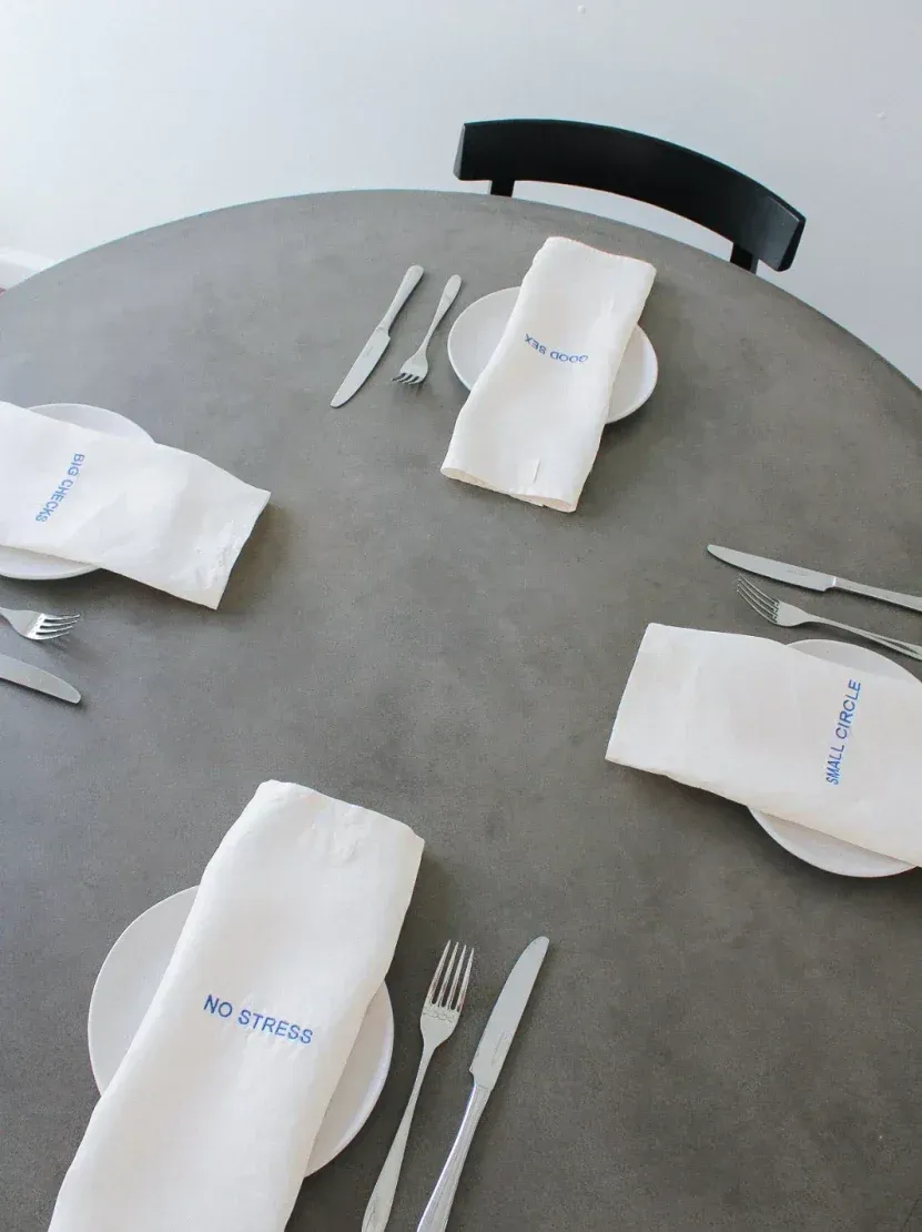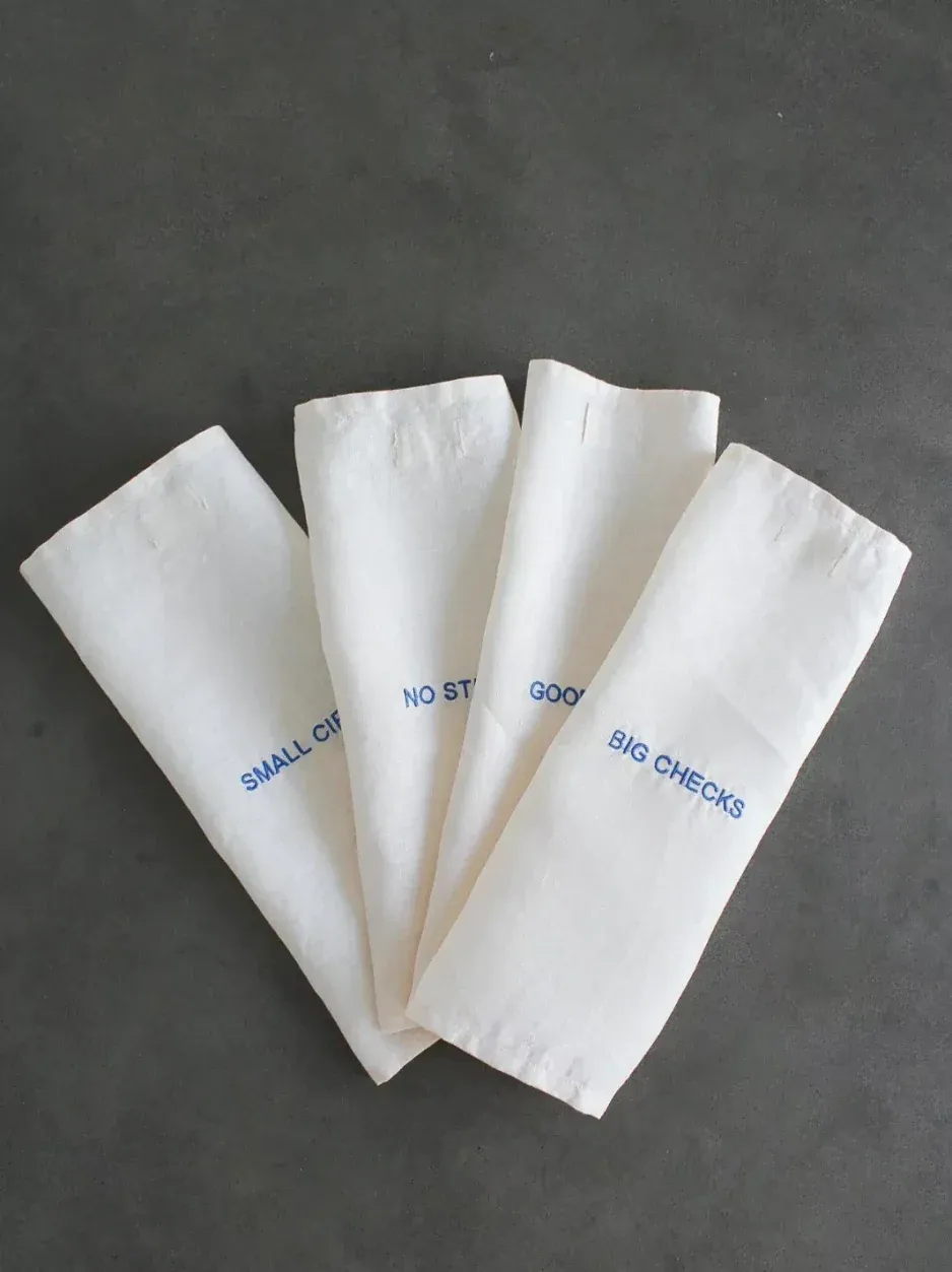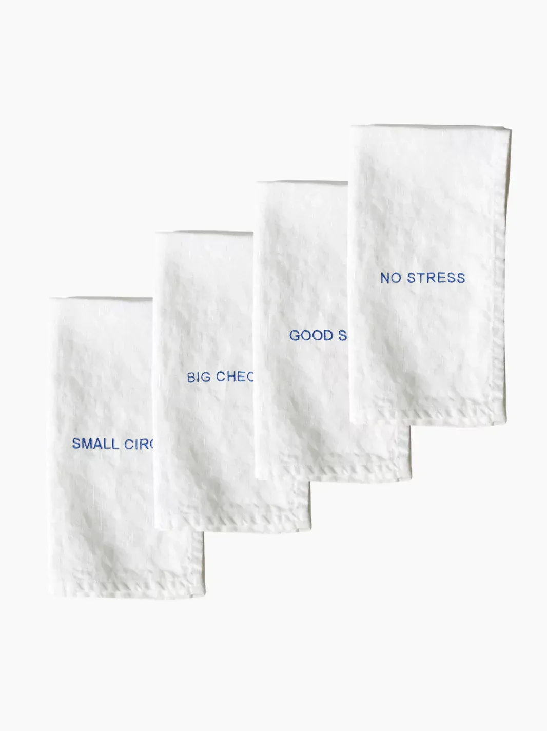 This set of 4 napkins are handcrafted from cream linen with hand-embroidered blue phrases reflecting the key components to living your best life: Small Circle, No Stress, Good Sex, Big Checks. Aesthetic with just the right amount of cheekiness, they make a witty birthday, housewarming or just because gift.