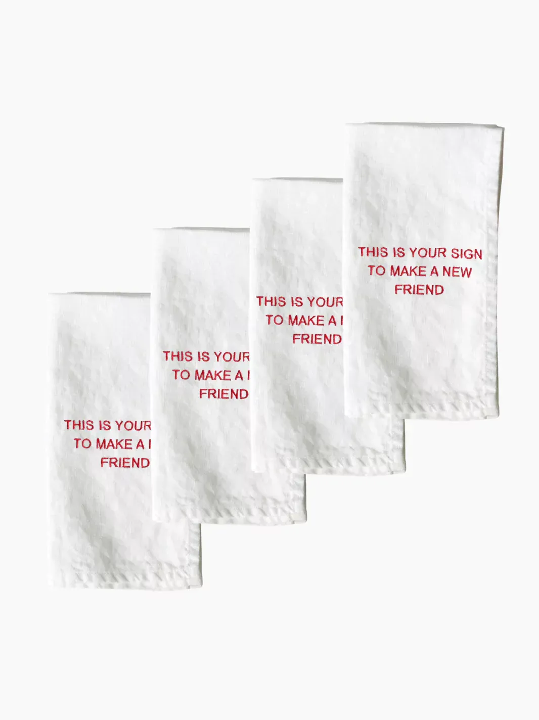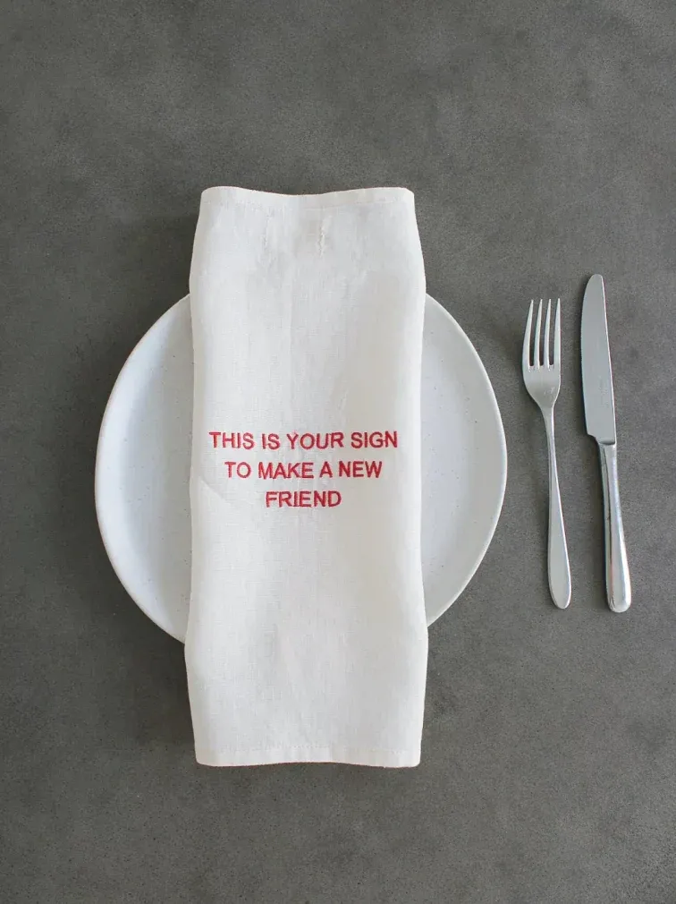 This set of 4 napkins is crafted from cream linen with hand-embroidered red detailing. Abstract and aesthetic with a touch of humour, they are a playful addition to eloquent dinner parties and make a witty birthday, housewarming or just because gift for the host who never learns not to mix friend groups.