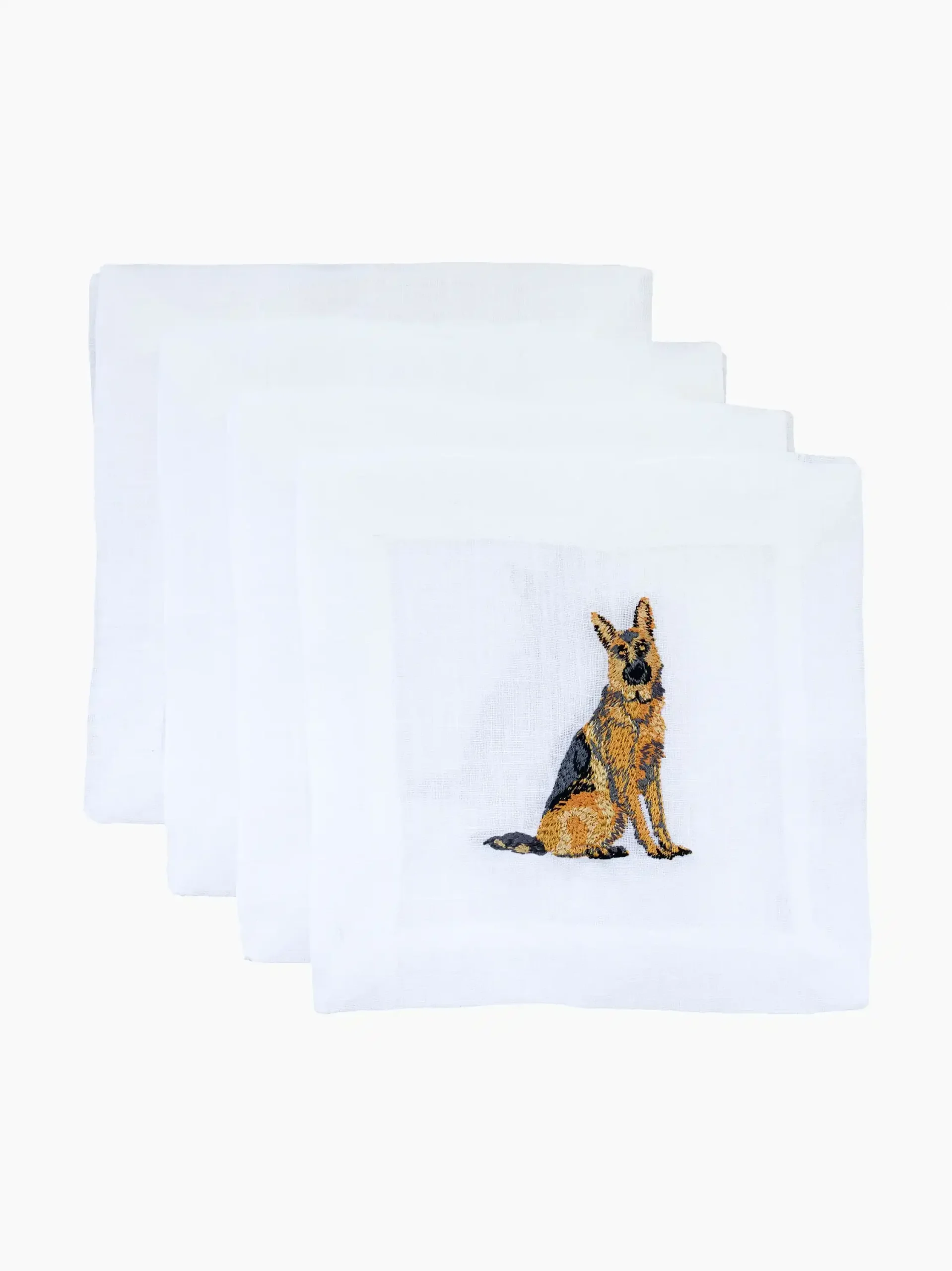 This set of four cocktail napkins features a German Shepherd embroidered on pure linen. The ultimate addition to elevate a dinner party and the perfect gift for the hostess whose pooch is the permanent VIP.