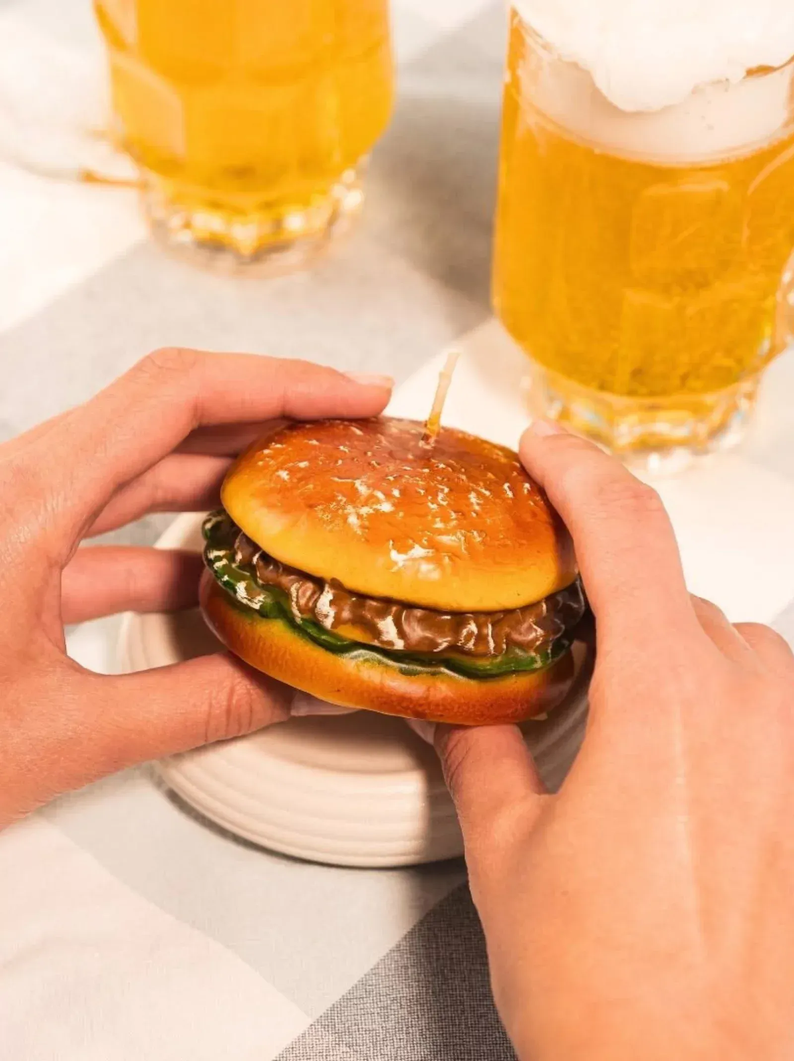 This hyperrealistic hamburger candle is hand-poured and shaped to perfection, ideal for eclectic tables, bold shelves, or anyone who likes their decor well done.