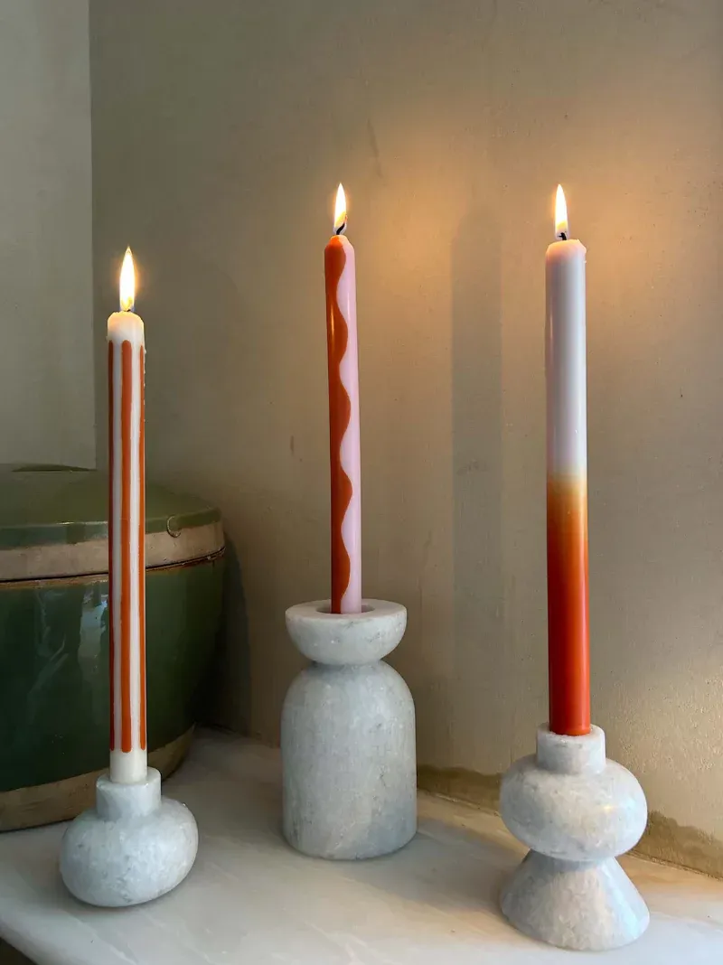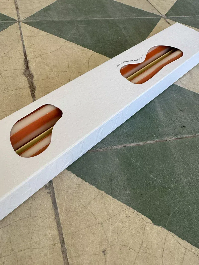 This set of 2 dinner candles is hand-poured from natural vegetable wax in organic stripes of off-white and burnt orange. A chic thank you gift the avid host.