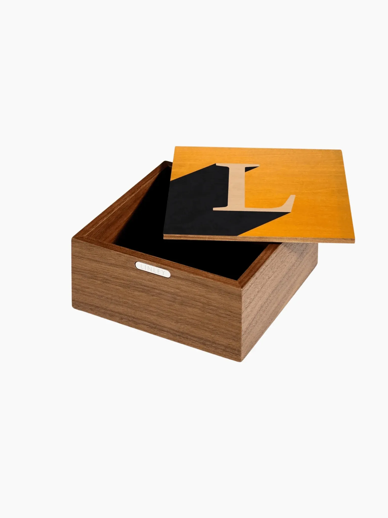 This luxury trinket box features an L initial against a contemporary amber background finished with a bold marquetry inlay. A unique gift for birthdays and christenings or a thoughtful thank you.