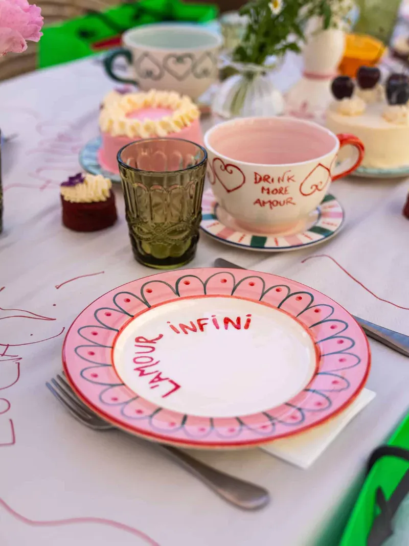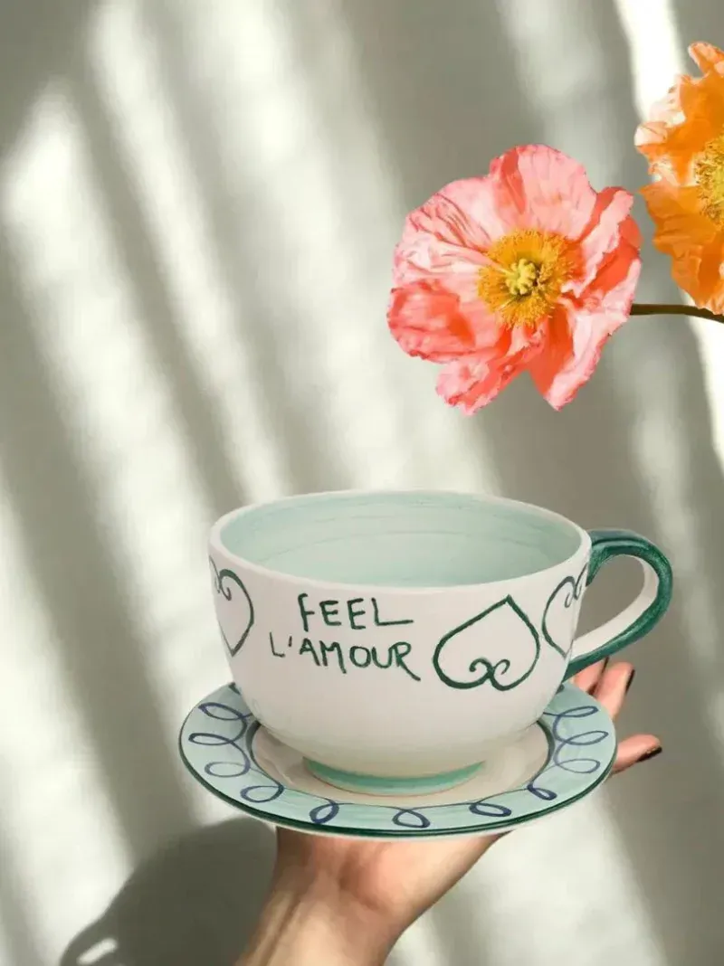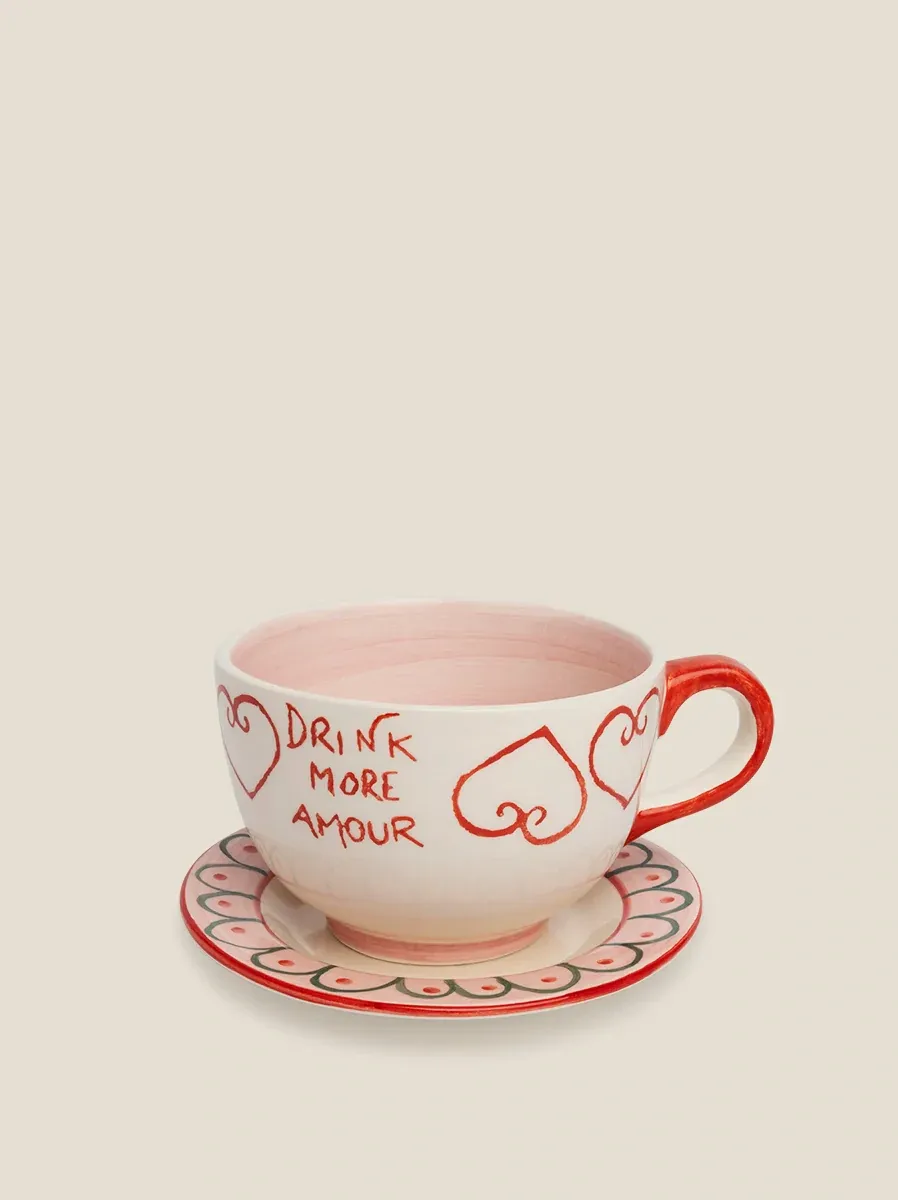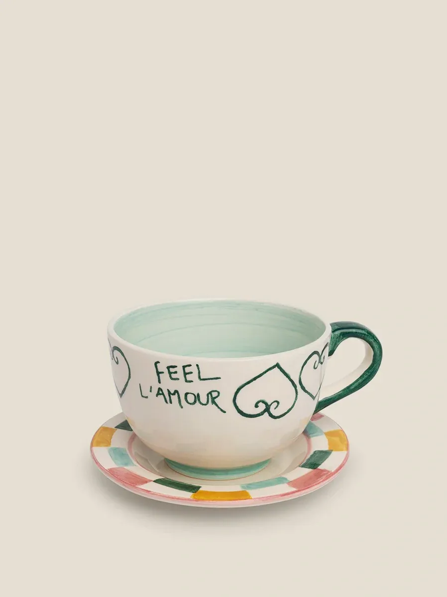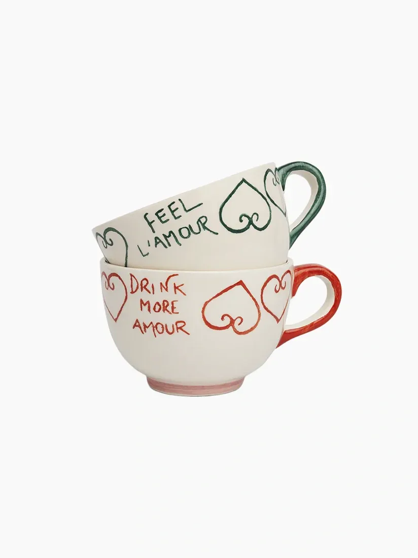 This set of 2 mugs is artisan-made and hand-painted in green and red, featuring a sweet design of hearts and text which reads ‘Drink More Amour’ and ‘Feel L’Amour’ in contrasting colours. For the coffee or tea enthusiast, a statement addition to their daily routine.