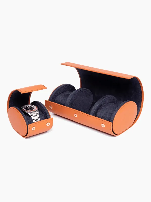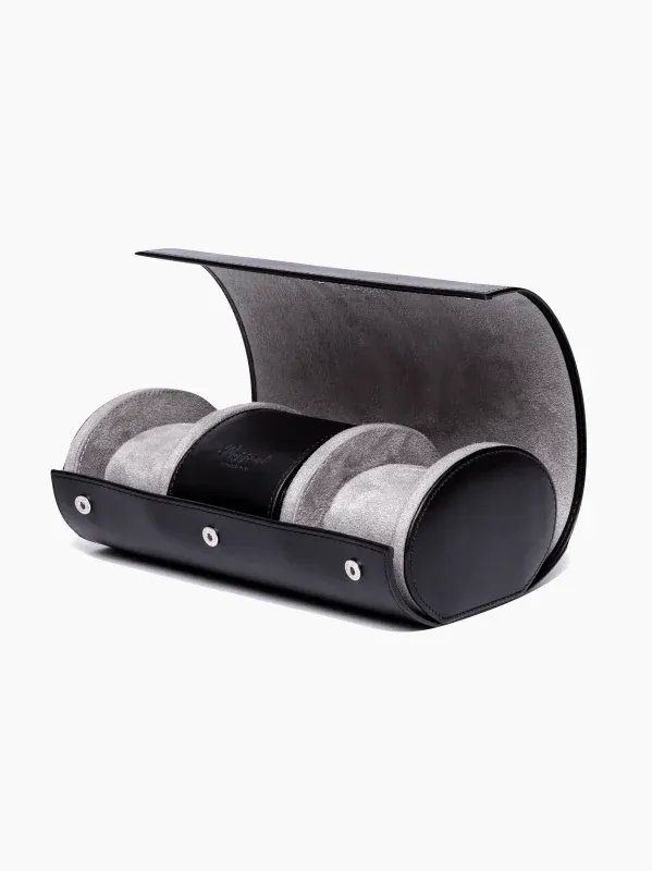 This three-piece watch roll is crafted from smooth grain leather with a luxurious suede interior. Featuring two plush watch cushions and a centre compartment for a watch, cufflinks or accessories. The ultimate travel gift for him.
