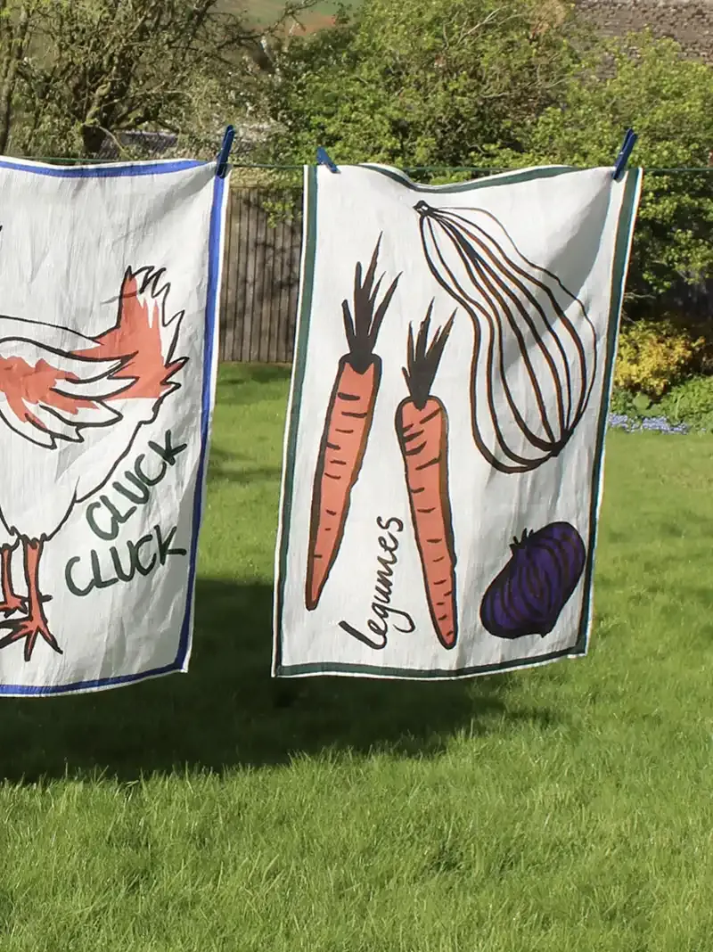 This tea towel is sustainably crafted from the finest European linen. Featuring an abstract illustration of vegetables and hand-written text, it makes an aesthetic kitchen addition.