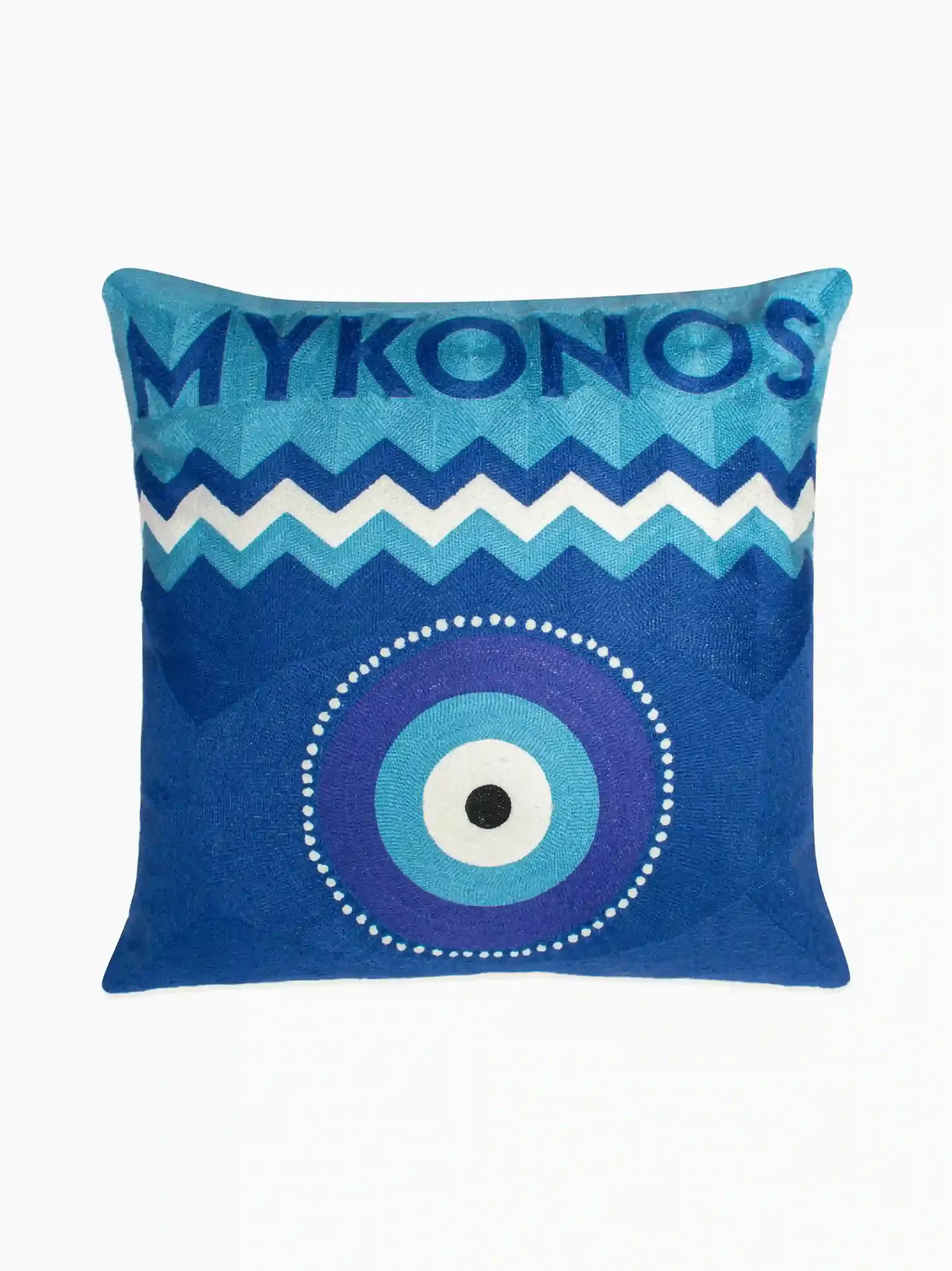 This Mykonos Needlepoint Cushion features a statement evil eye motif complete with a plush blue velvet back. Intricately hand stitched, it is the perfect housewarming gift for the avid island hopper.