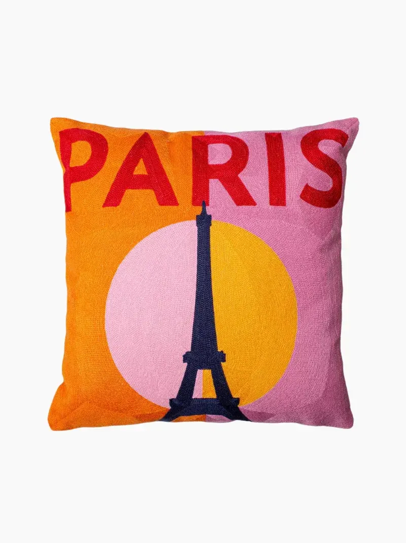 This Paris Needlepoint Cushion features a vibrant Eiffel Tower motif complete with a plush pink velvet back. Intricately hand stitched, it is the perfect housewarming gift for a globe-trotting duo.