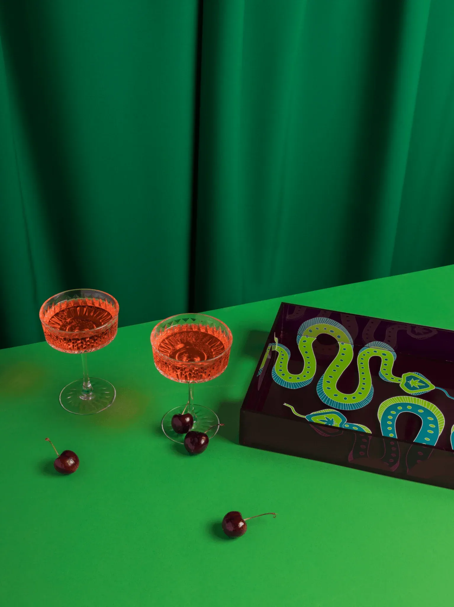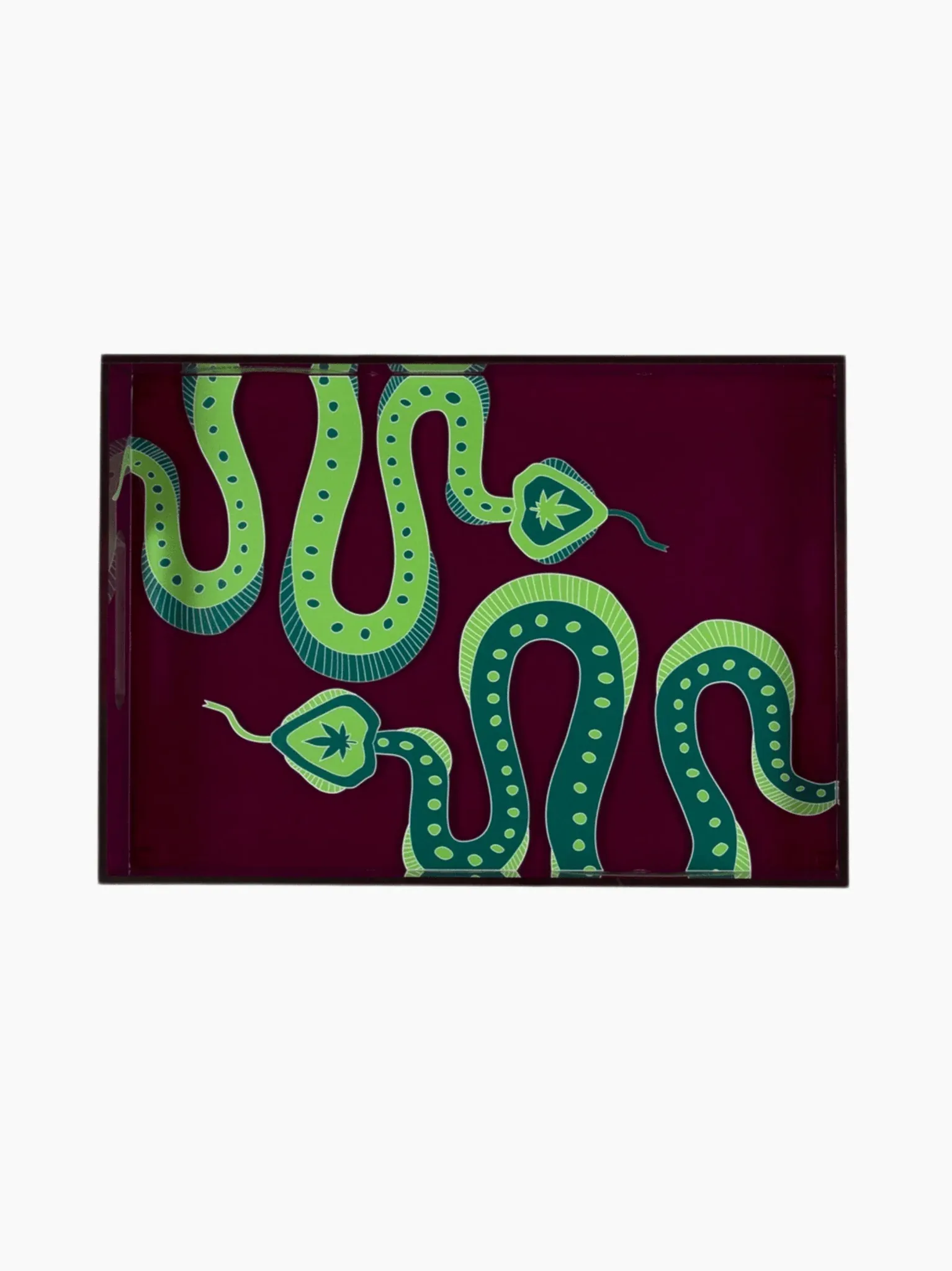 In a regal maroon, this handcrafted tray features sultry serpents in a contrasting green for an ultra-chic contemporary aesthetic.