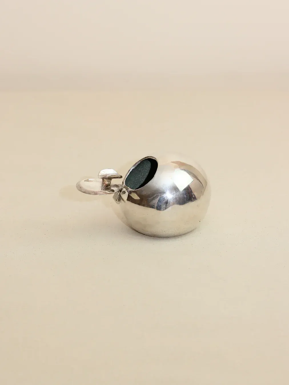 This sculptural brass ashtray has unmistakable Space Age flair. Shaped like a gleaming sphere, it features a foldable lid and an inner bowl designed to cradle a cigarette or cigar. Marked with the Almazan seal, this piece is a refined nod to mid-century futurism – equal parts function and form.
