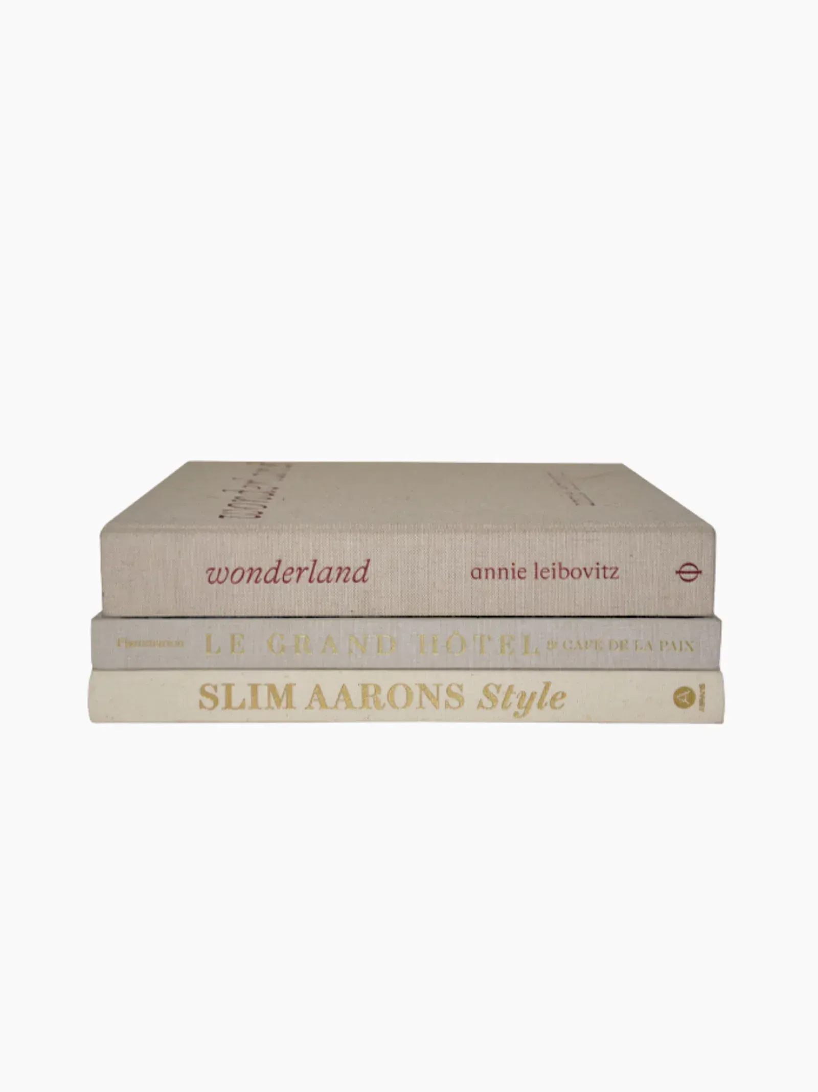 This cream book stack spotlights Annie Leibovitz’s lens on high fashion and cultural icons, the polished elegance of Parisian hospitality, and Slim Aarons’ effortless take on old-school glamour. Each title is a study in style with substance. Perfectly curated. Quietly commanding.