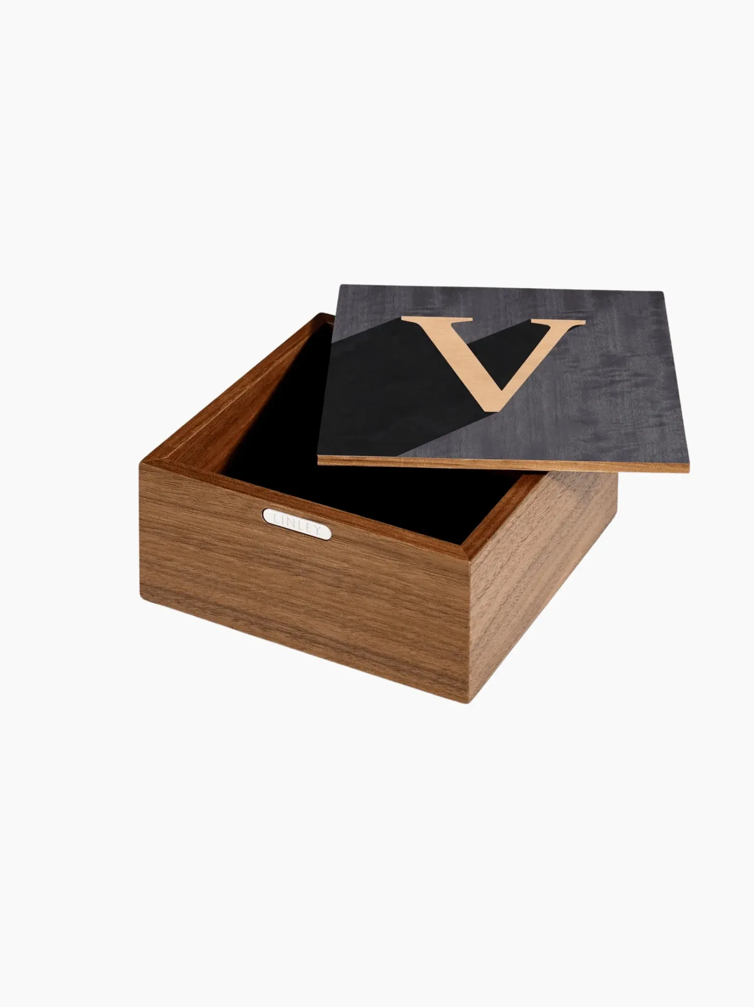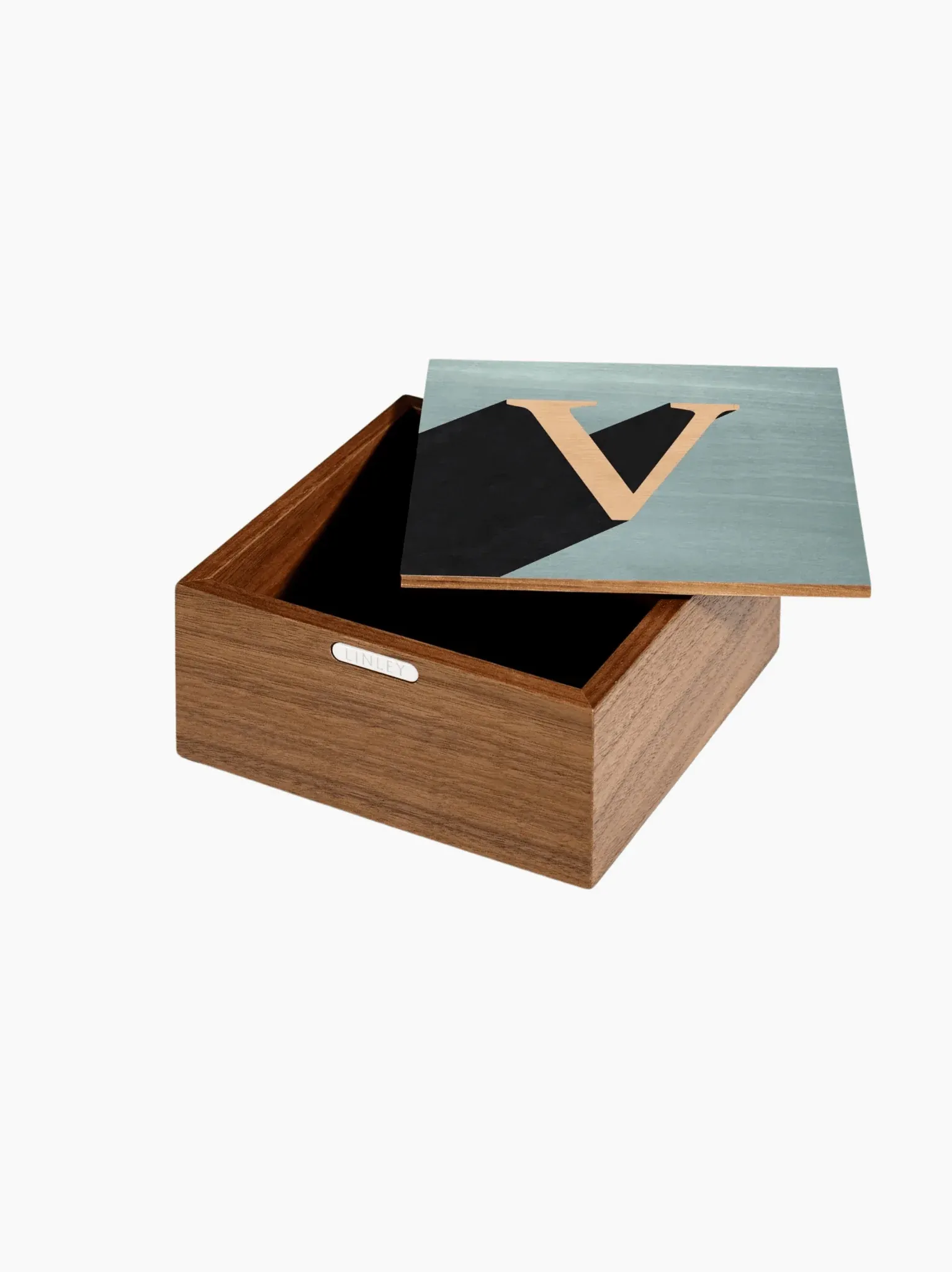 This luxury trinket box features a V initial against a contemporary blue background finished with a bold marquetry inlay. A unique gift for birthdays and christenings or a thoughtful thank you.