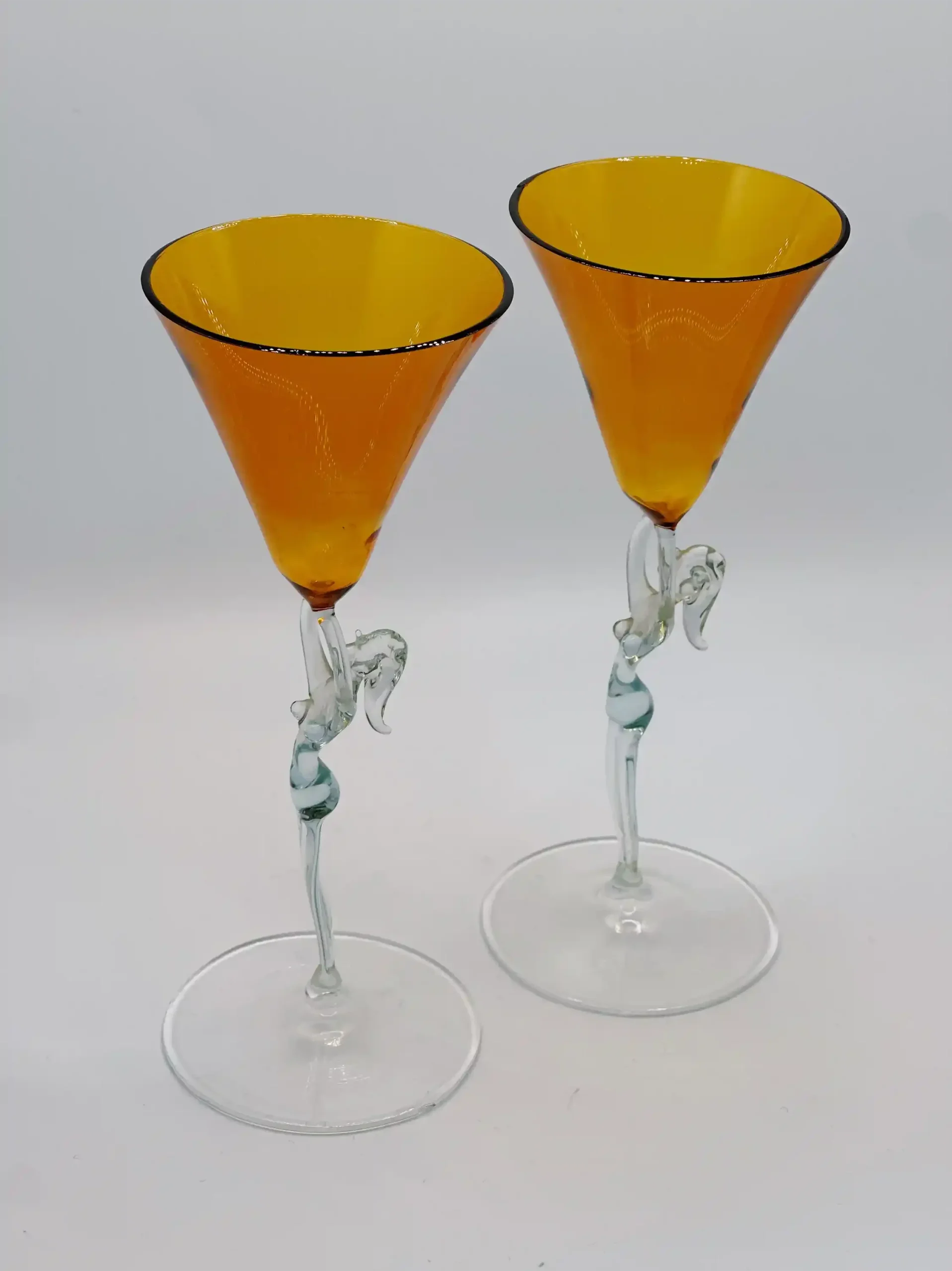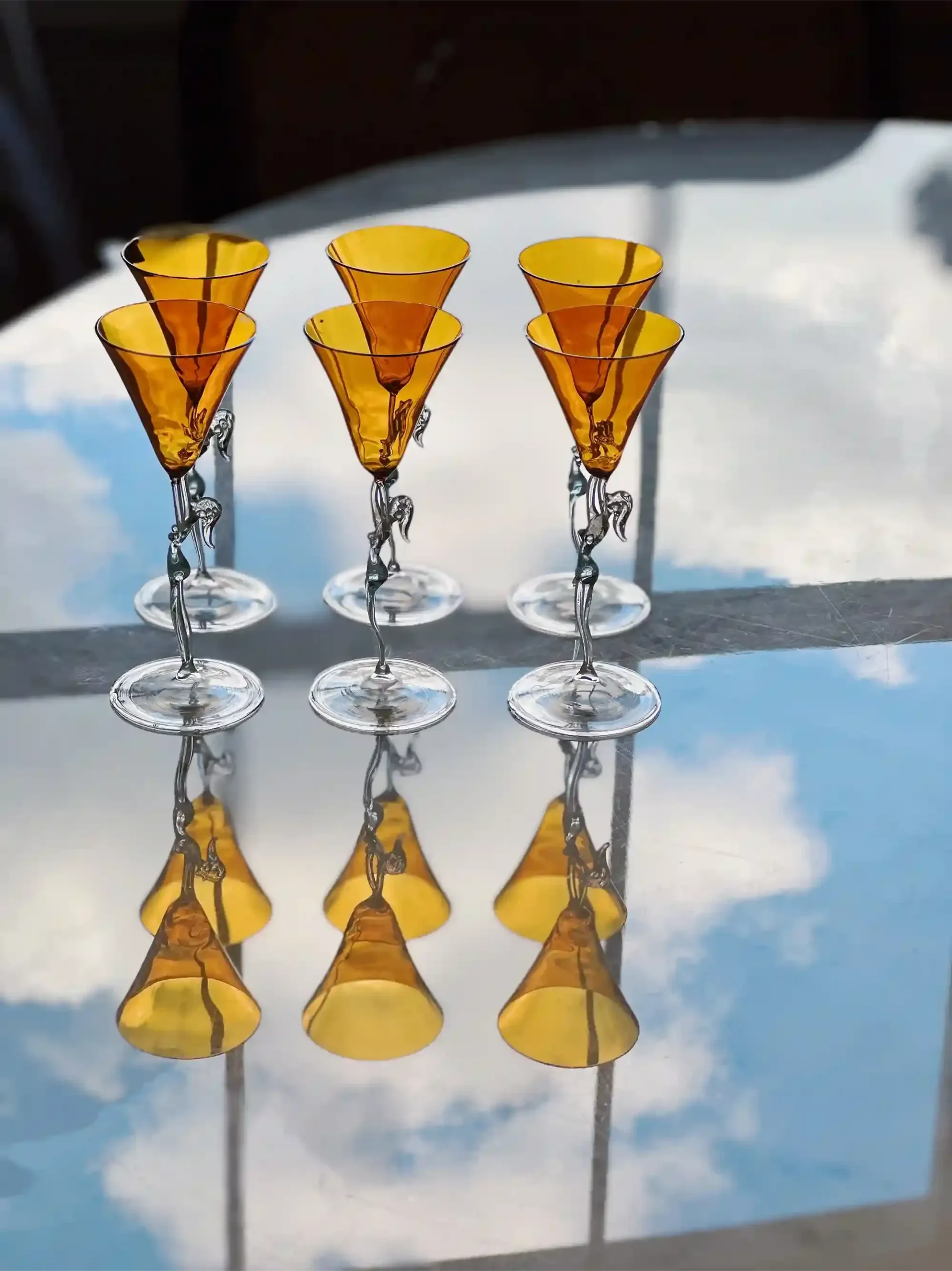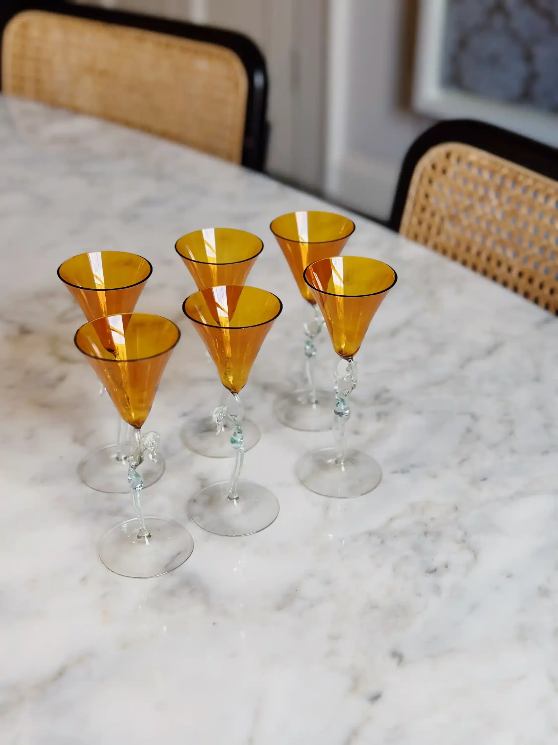 This vintage liquor glasses set features captivating amber coupes and white silhouette stems. A one-of-a-kind choice of luxury gifts for women for housewarmings or weddings alike.